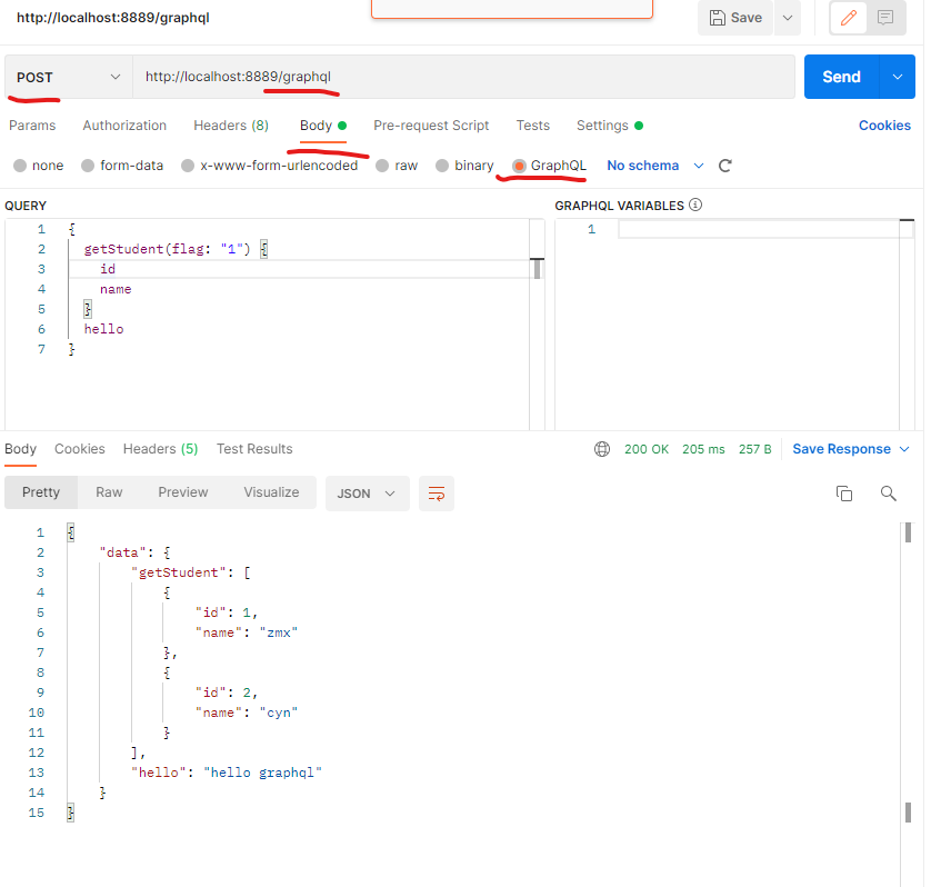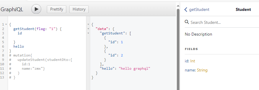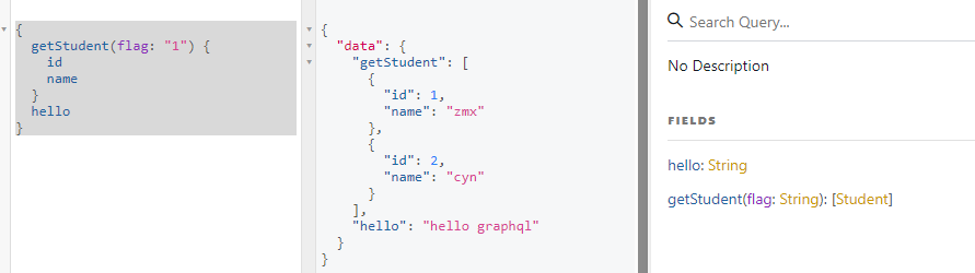 - 我们可以发现,一个请求我们同时调用了getStudent(String flag)和hello()两个接口,并且同时得到了它们的返回数据。并且如果你想要在getStudent返回的时候,只返回id的列表,那么你在查询时可以不写name字段,这样返回的结果便不会携带name(即实现了按要求返回)