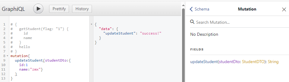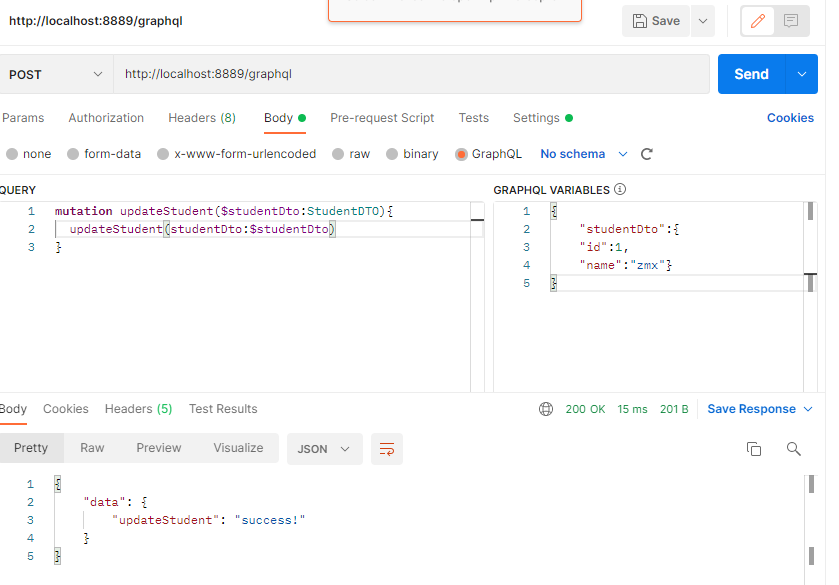 - 下方GRAPHQL VARIABLES的框内,可以填入请求的参数,在修改学生信息接口中为StudentDTO对象。